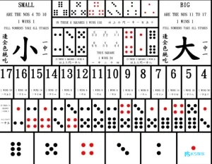 1. 大小:玩家可以下注骰子总和的大小。总和为4-10点为小,11-17点为大。围骰(即三颗骰子点数相同)除外。